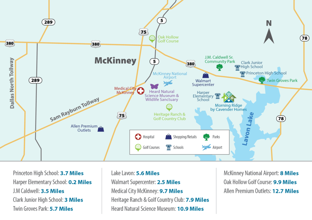 Situated in one of the most rapidly growing cities in Collin County, between Greenville and McKinney, Texas on U.S. Highway 380, Morning Ridge’s houses for sale are far enough to be affordable, yet close enough to be comfortable. Morning Ridge is a new community from Cavender Homes that makes getting anywhere in the Dallas-Fort Worth area you want easy. Local shops and restaurants in downtown Princeton are just two miles from your Morning Ridge home, or head to Eldorado Plaza in McKinney, TX 15 minutes away to get your favorites from Trader Joe’s or outfit your new home at Bed Bath and Beyond. Water sport and camping enthusiasts will love living just a short drive from Lake Lavon and Lake Ray Hubbard parks. Commuting to work is a breeze with easy access to the Sam Rayburn and Dallas North Tollways as well as US-75.